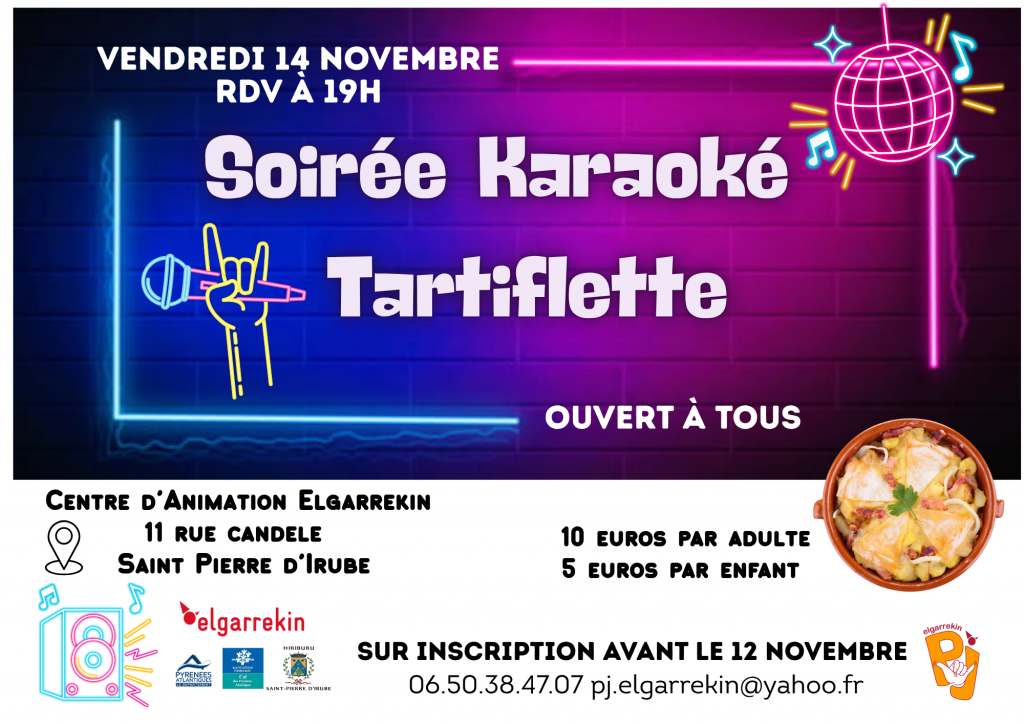 Vendredi 14 novembre, à partir de 19H, le Centre d’animation Elgarrekin vous propose une soirée Karaoké / Tartiflette. Inscription obligatoire par mail ou par téléphone avant le mercredi 12 novembre.